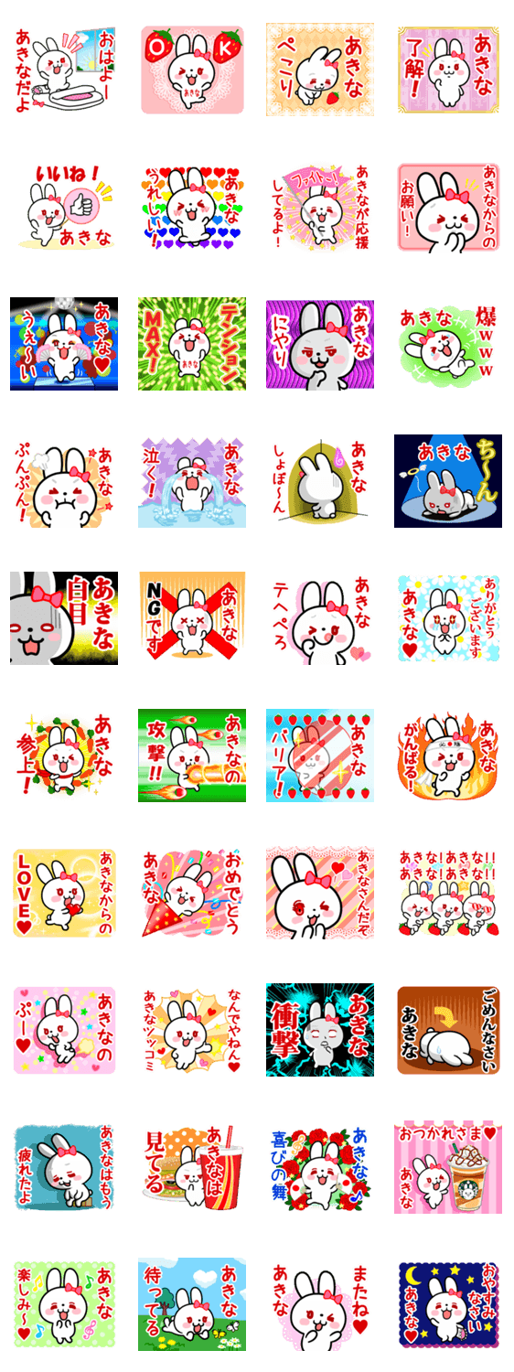 「あきな」ちゃん、「あきな」さんのための名前スタンプです。白いうさぎがかわいく気持ちを表現します。毎日よく使う言葉を集めました。よろしくお願いします♪