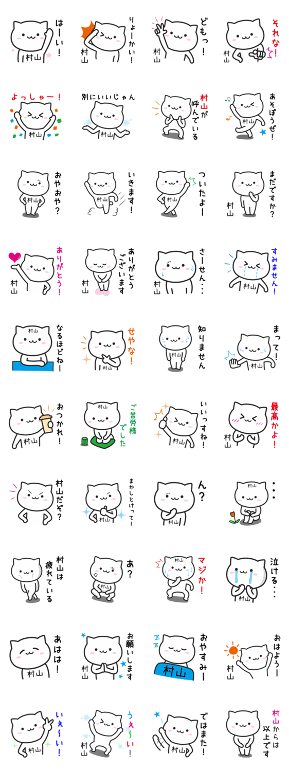 名字(苗字)が村山(むらやま)の人専用の、ねこの名前スタンプです。日常会話で使いやすいシンプルな基本セットです。村山さんへのプレゼントにも。