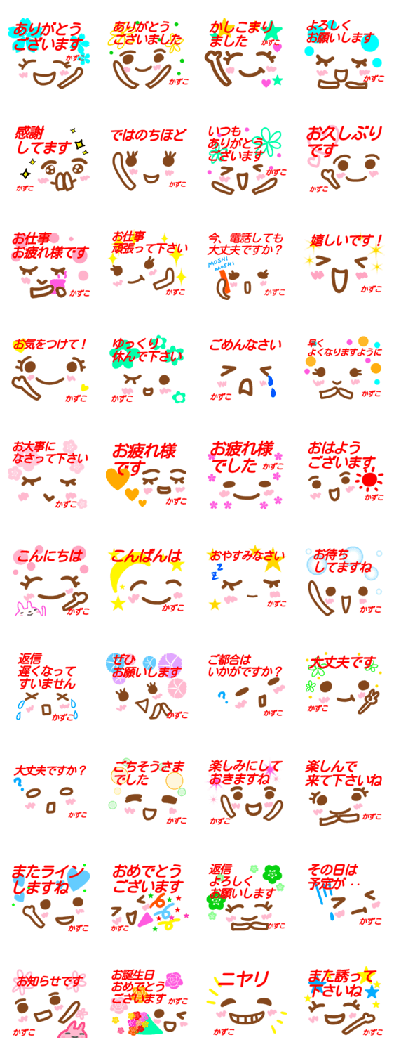 【名前スタンプ】かずこさん、ちゃん(和子、一子、数子、カズコ)が使う顔文字スタンプです。敬語での挨拶基本セットです。
