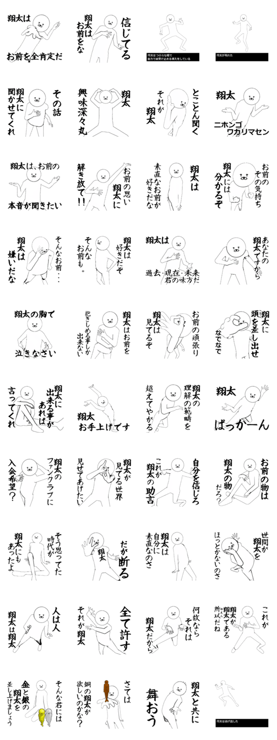 翔太さんの翔太さんによる、翔太さんの為のスタンプです。しかし何だか偉そうな白い奴なので使う相手を選びます。名字・苗字/名前シリーズ第1弾(しょうた/かなた/はやた等)