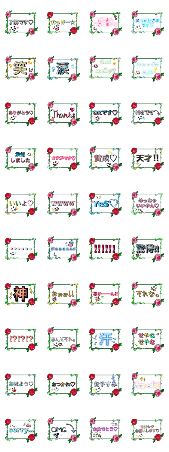薔薇の花好きの為の吹き出しコメント風スタンプ。目上の方から親友まで使えるお返事、相づち、挨拶を揃えました。いろんなシーンでお使い下さい。英語、関西弁もあります。