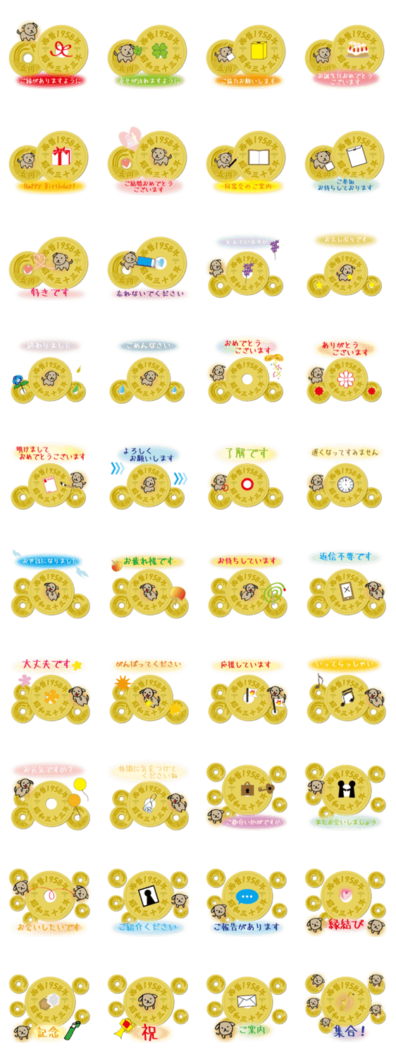 御縁がありますように。フデ五の西暦1958年(昭和33年)の五円玉のラインスタンプ。干支は戌年。誕生年や卒業年、結婚記念など記念の年の方向け。ライン着せ替え版有り。
