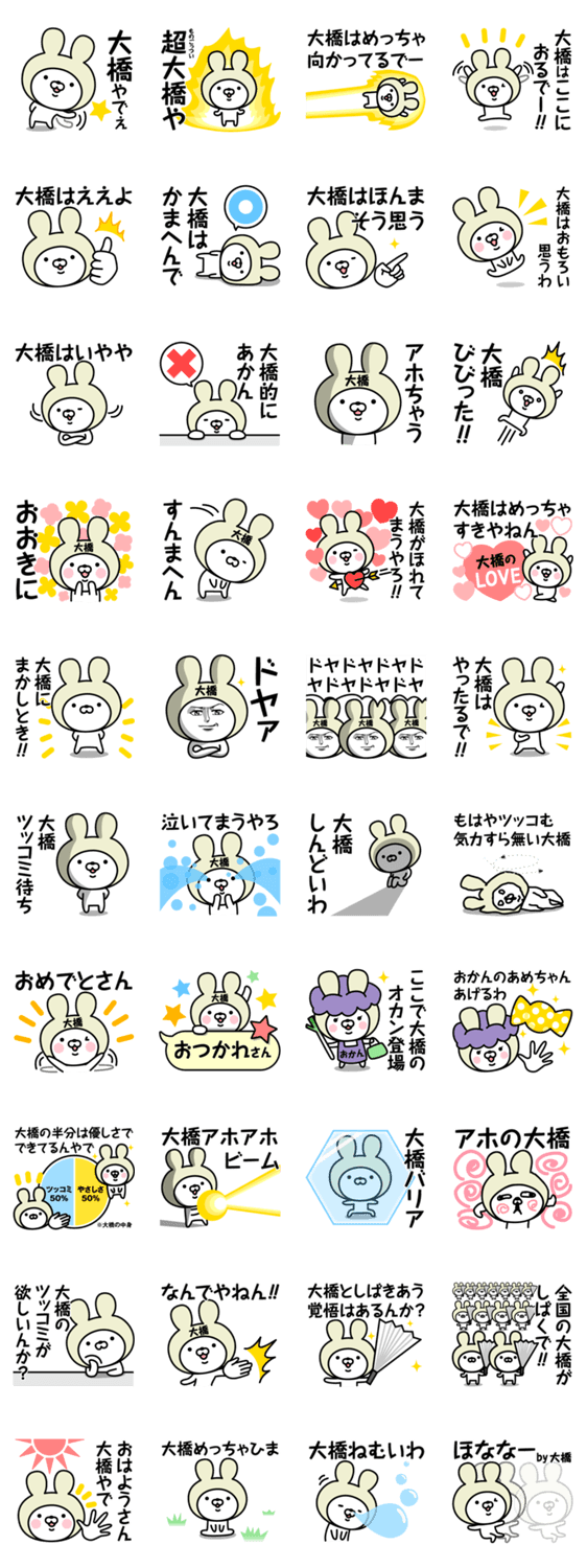 大橋さん用の名前で方言スタンプ。おおはしさんが使える関西弁・大阪弁のうさぎです。オオハシさんは是非どうぞ。