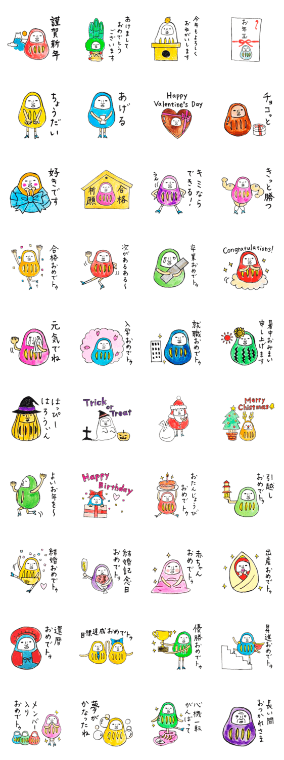 群馬出身の話す虹色のだるま達の第四弾です。今回はお正月、クリスマス、ハロウィン等のイベントや誕生日等の各種お祝いを取り揃えています。