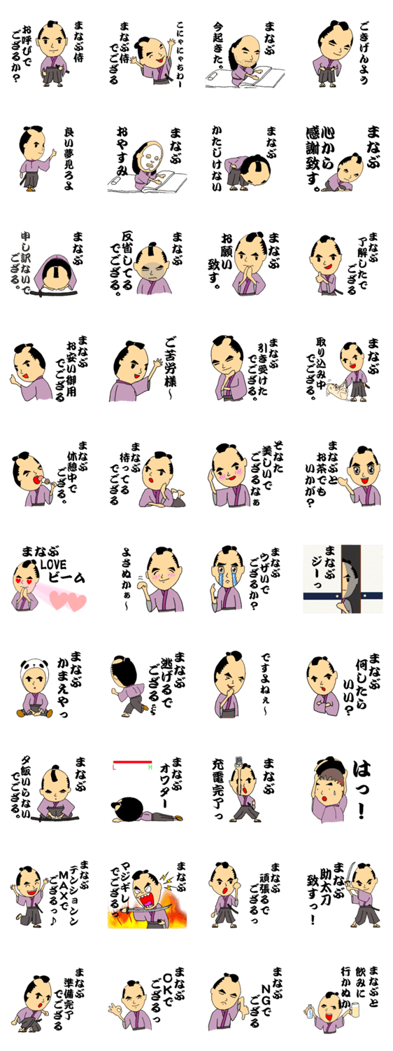 まなぶ専用のちょっとお茶目な『サムライ』スタンプの第2弾でござるっ。 さむらい気分で言いたいことをサッパリと言ってみよう! マナブ集合でござる。