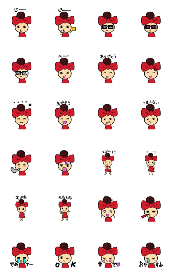 髪に大きな赤いリボンがついているりぼん姫のスタンプです。