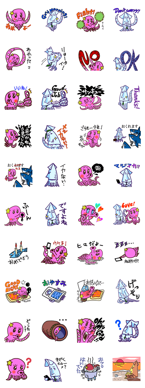 | スタンプ説明 | おはようからおやすみまで、いかすイカオとかわいいタコミの生活です。けっこう使えるあいさつがいっぱい!(イカオのネクタイはワカメで、タコミの頭のはヒトデです。) |