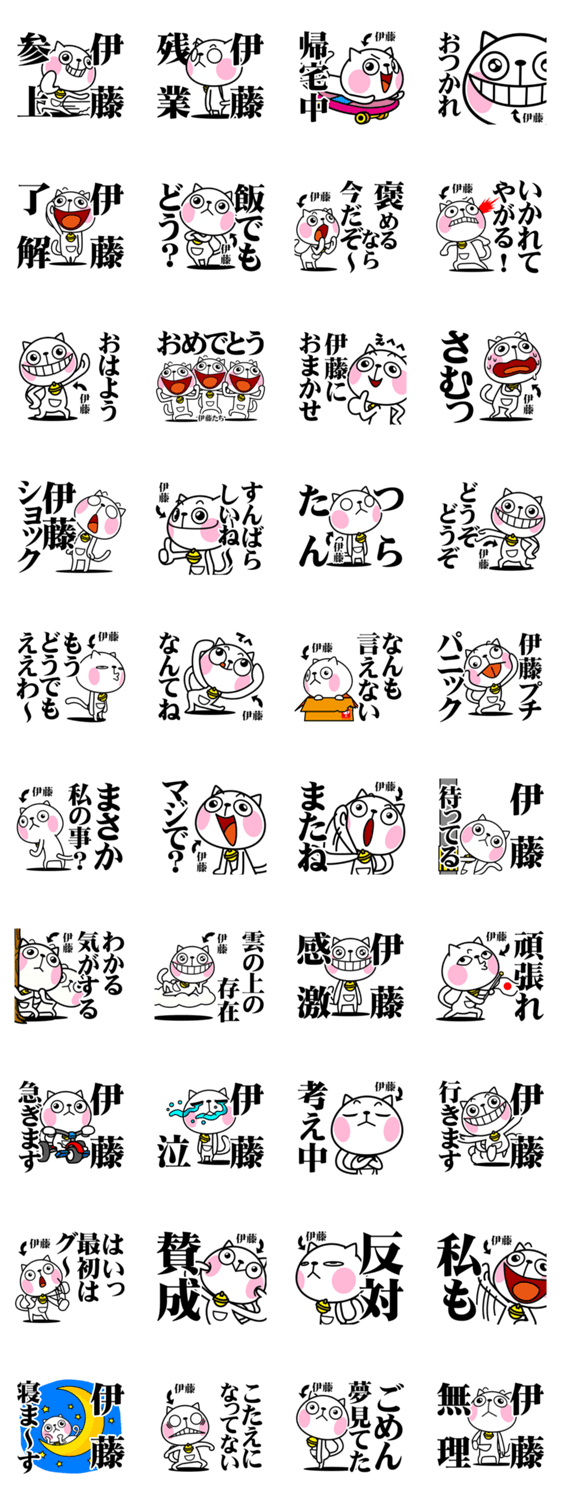 | スタンプ説明 | 大人気ウサギ魂の友達、ネコ魂が【いとう】さんの魂を受け継ぎスタンプになって登場です。全国のイトウさん!楽しく使ってね。伊藤さんが大好きな方もプレゼントにどうぞ! |