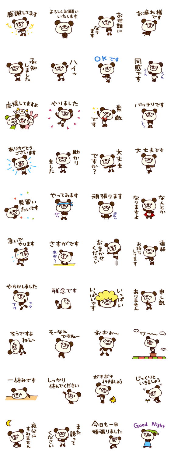 | スタンプ説明 | しゃかりきなパンダ第3弾。今回は敬語編です。礼儀正しい丁寧な言葉は気持ちがいい。今日もシャカリキに敬語を使おう。家族、友人、お仕事、学校でも。 |