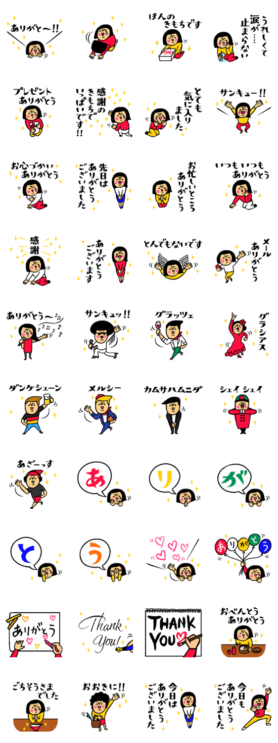 | スタンプ説明 | 「ありがとう」をはじめ、日常でのお礼のシーンに役立つスタンプ集!感謝の気持ちを忘れずに、清々しい毎日を過ごしましょー♪ |