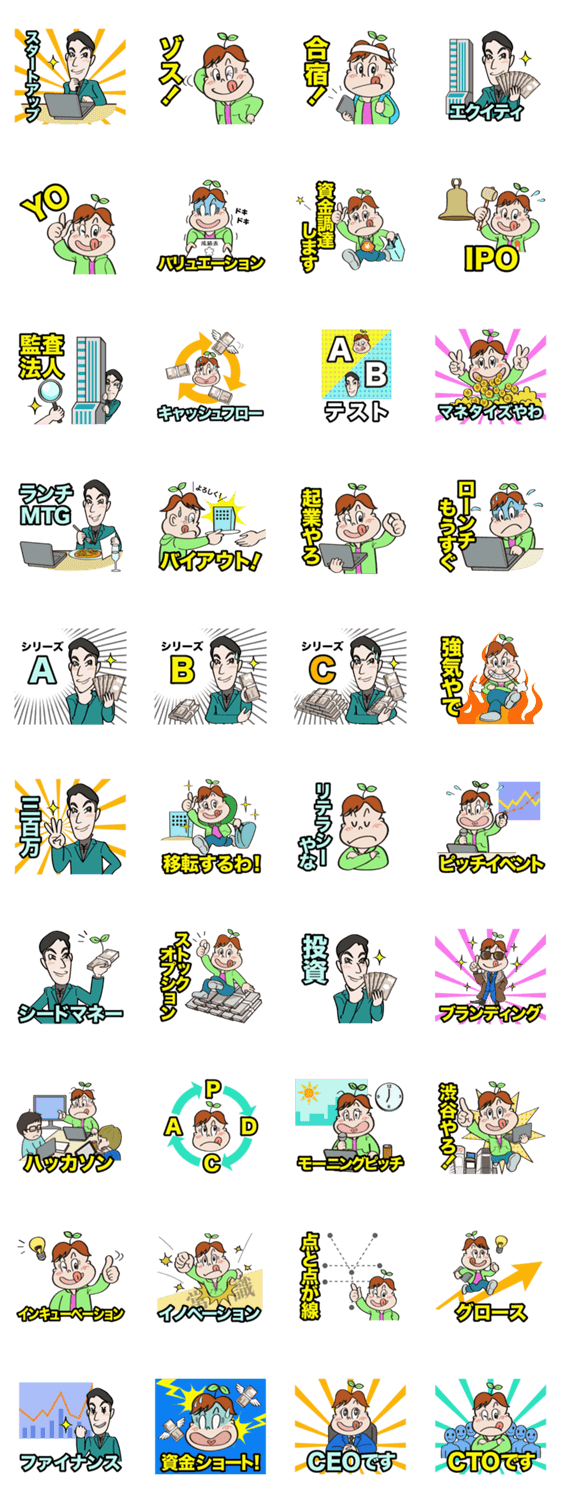 ベンチャー、起業、スタートアップを志す人にぴったりのスタンプ。社長同士の日常会話はもちろん、ビジネス用語を使いこなしてあなたも起業家たちの仲間入り?!