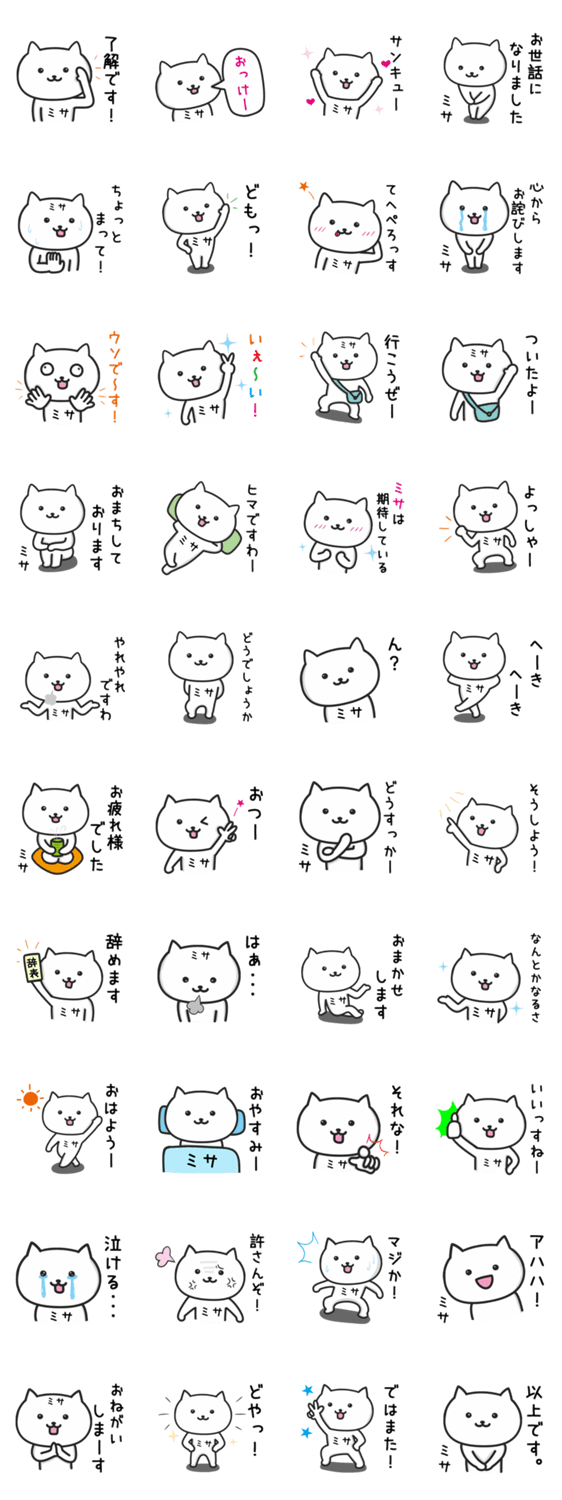 「ミサ」専用の,猫の名前・あだ名スタンプです。みさき,みさ,みさと,みさこ,みさお,みさわ,美沙,美佐,美紗,美彩,三咲,三紗,光沙,実沙,未彩,未沙,美咲,美早,美抄さんなどに