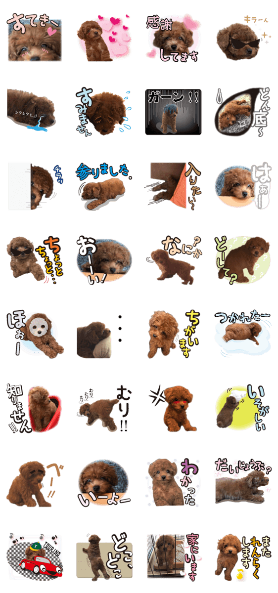 犬・動物好きの方へ。可愛い赤ちゃん顔の癒し系トイプードルです。日常の気持ちをメインに集めた、文字が大きく見やすい写真スタンプ。