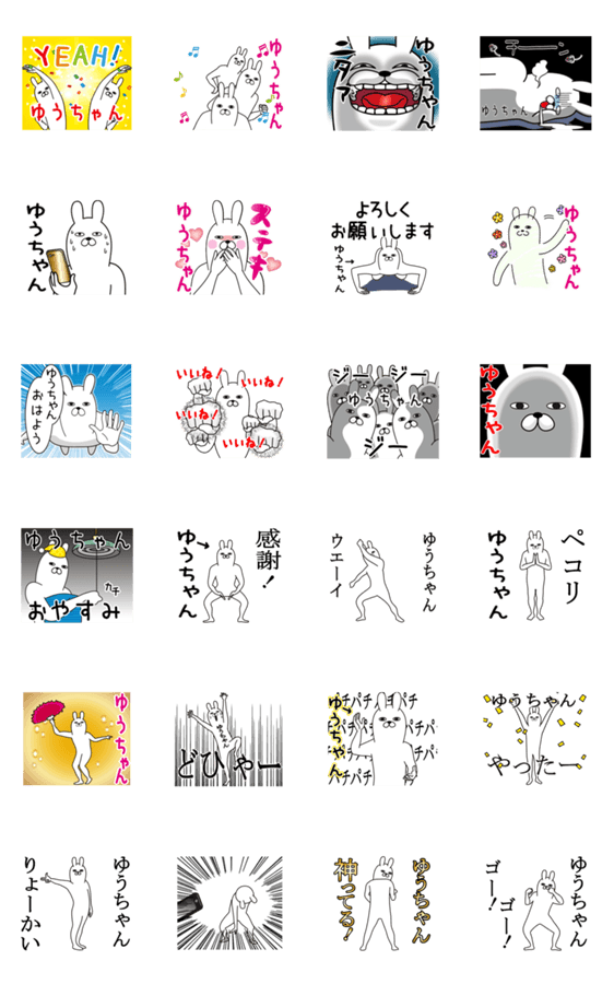 ゆうちゃんが使う面白スタンプ。ゆうき,ゆうすけ,ゆうこ,ゆうや,ゆうか,優子,祐樹,有紀,優香,優佳,勇樹,悠子,佑香,裕樹,雄輔,悠希,祐介などゆうちゃんがつく人専用スタンプ