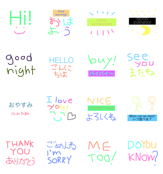 日本語と英語の短い挨拶をまとめたスタンプです。