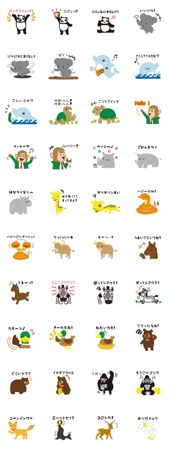 | スタンプ説明 | ダジャレ動物園の可愛らしいアニマルたちが繰り広げるスタンプです!動物たちがダジャレ(駄洒落)で会話をしています! |