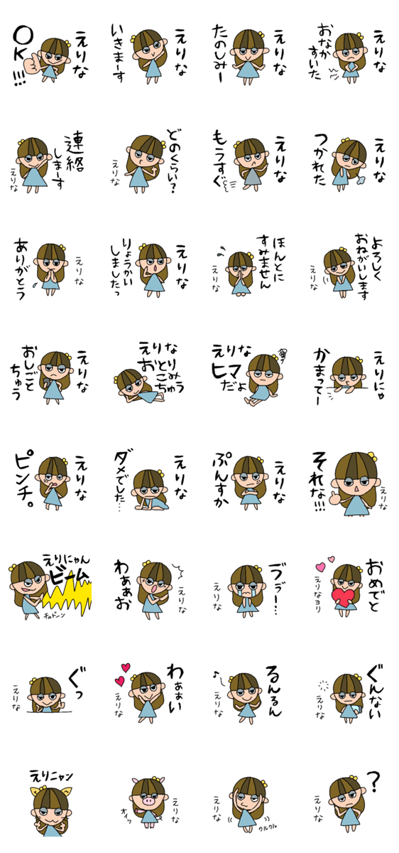 | スタンプ説明 | 全国のえりなちゃんにおくる、エリナ専用スタンプ! おちかくのえりなちゃんへのプレゼントにも♪ |