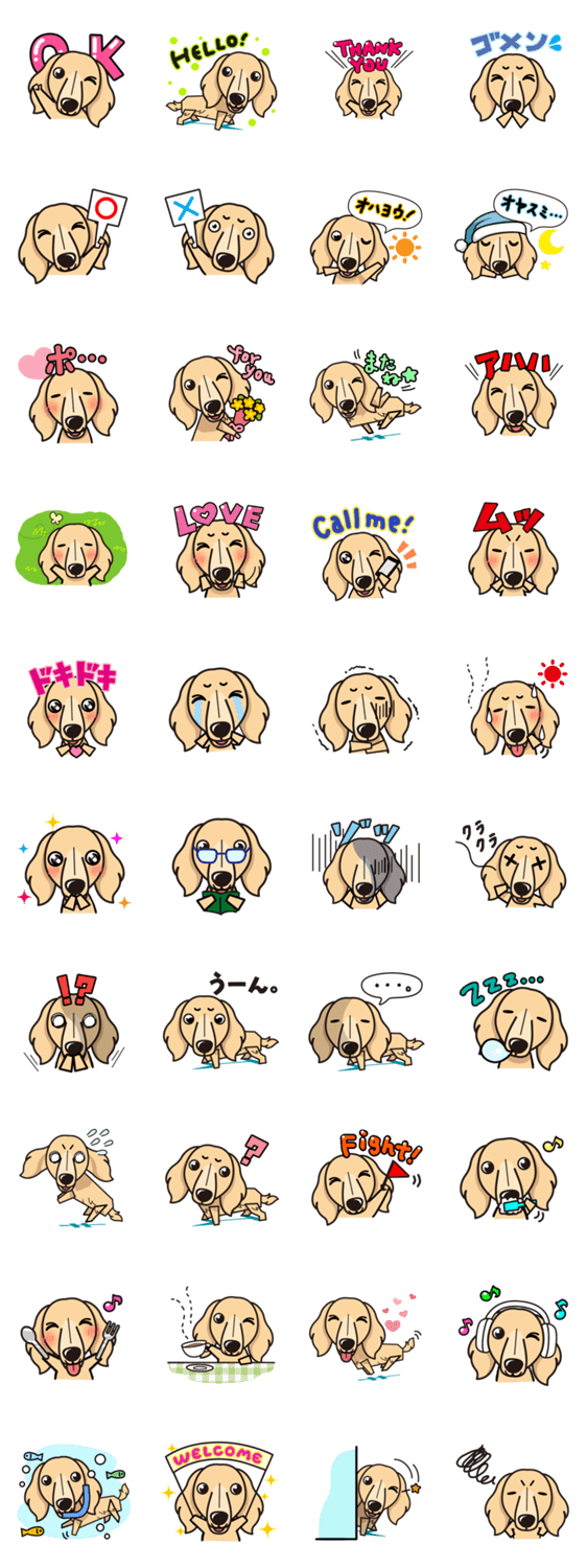 | スタンプ説明 | 「うちの子いるかな?」全130犬種のワンちゃんが、LINEスタンプに!表情豊かなスタンプでトークを楽しく盛り上げる♪iinu LINEスタンプ【ミニチュア・ダックスフンド】 |