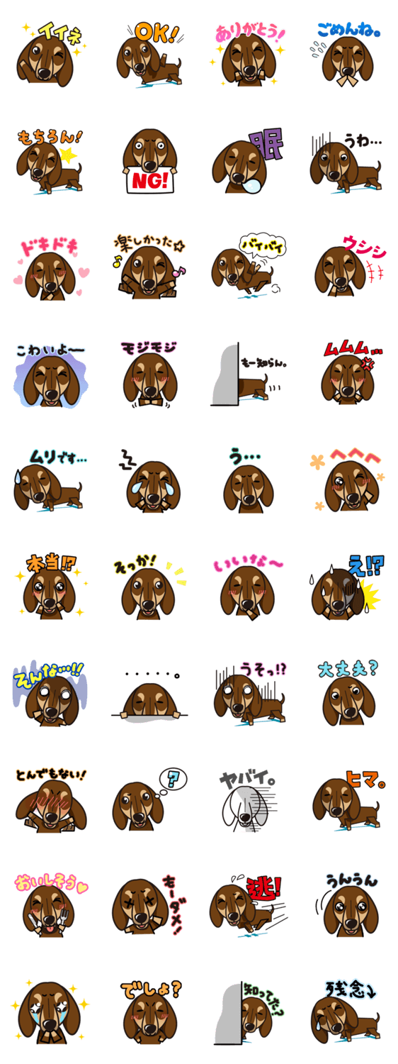 | スタンプ説明 | 「うちの子いるかな?」全130犬種のワンちゃんが、LINEスタンプに!表情豊かなスタンプでトークを楽しく盛り上げる♪iinu LINEスタンプ【ダックスフンド】 |