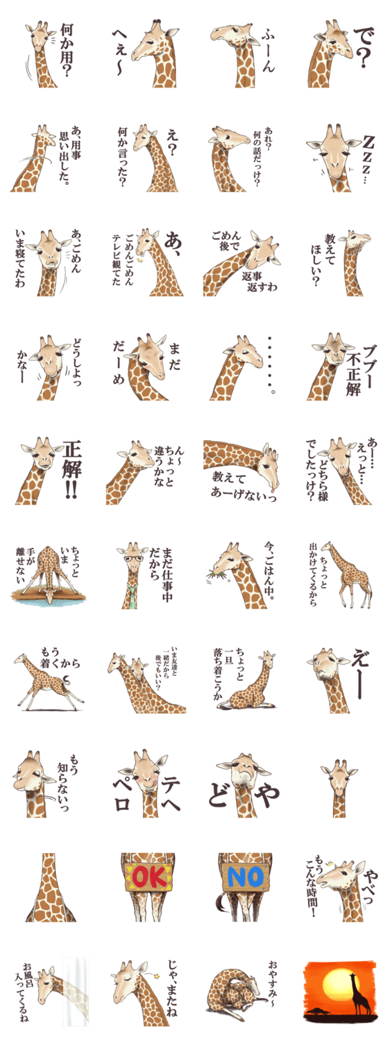 | スタンプ説明 | 特技は焦らすこと。キリンさんがあの手この手で会話を焦らします。 |