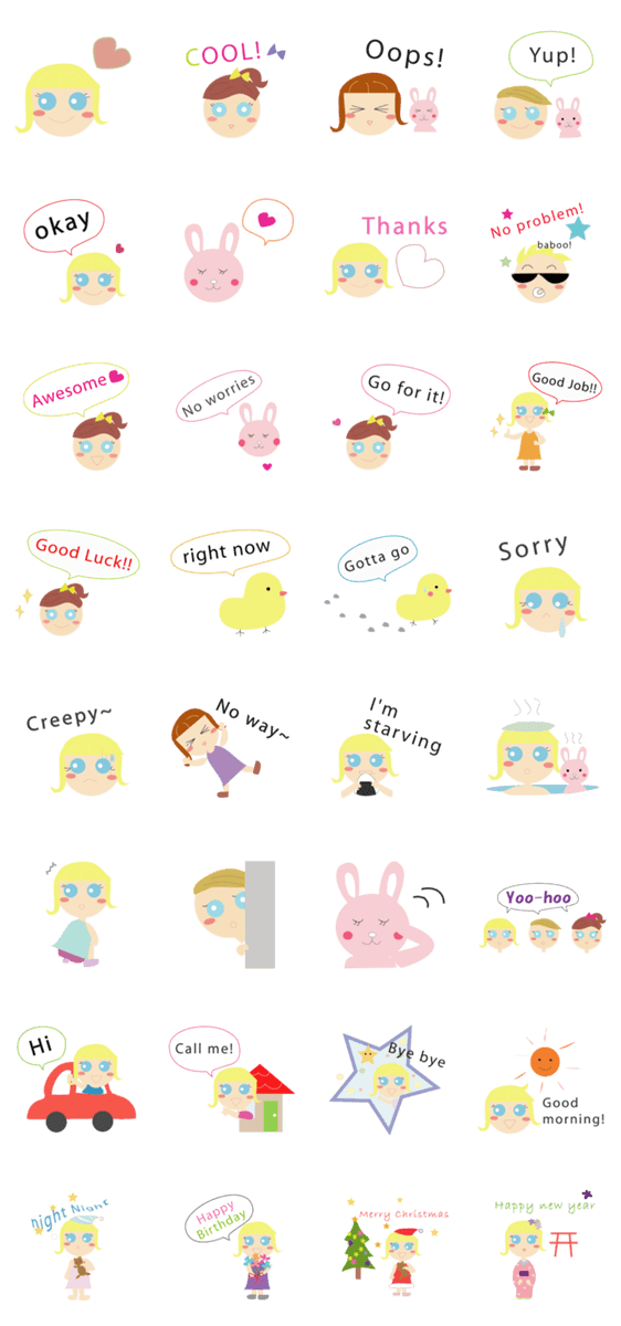 Girl with blue eyes & friends. I prepared Stickers of frequently used phrases and events such as Christmas and New Year.
