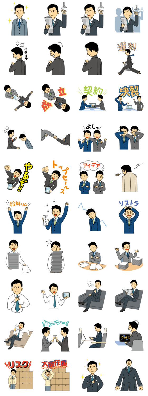 サラリーマンに起こる様々なシーンの数々をスタンプ化!ビジネス用途にもどうぞ。