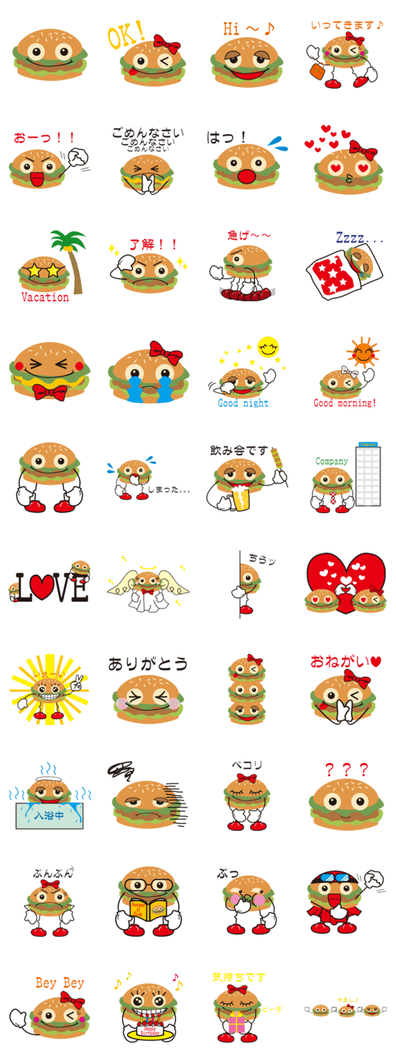 ハンバーガーを擬人化したイラストで日常会話で使えそうなものを作成しました。