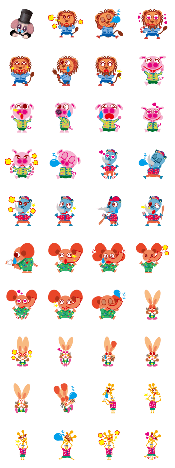 かわいい動物(ライオン・ブタ・サイ・ゾウ・うさぎ・キリン・犬)の基本的な(笑ったり、泣いたり、怒ったり、寝たり、恋をしたり、喜んだり)スタンプを揃えました。