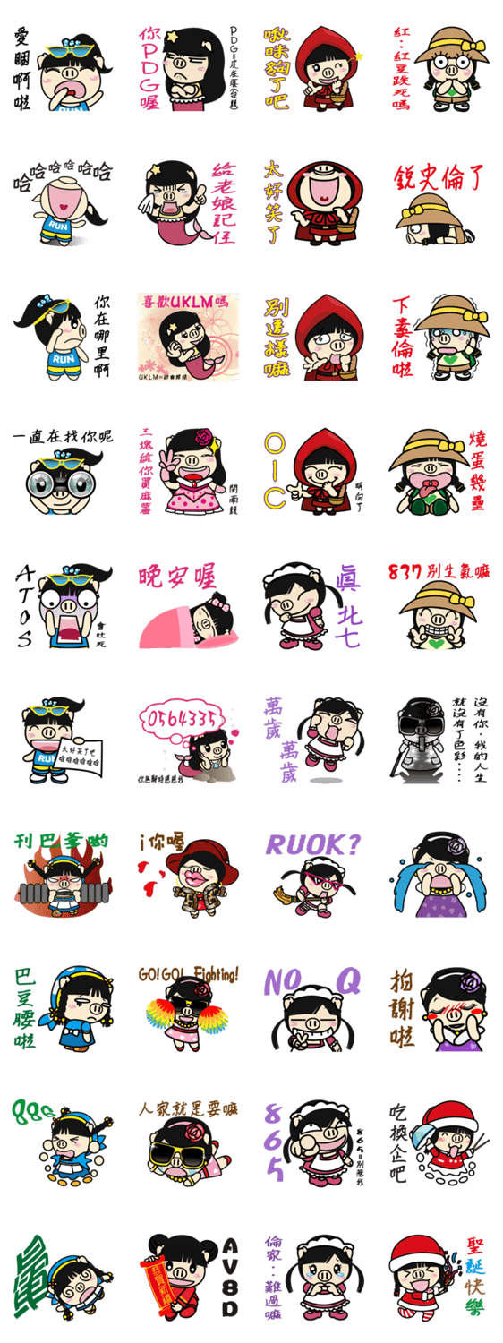 | スタンプ説明 | Introducing Variety Girl, Sister Piga Pig who dresses herself to the Little Red Riding Hood, Milk Girl, Little Mermaid, Dowager, Maid, Explorer and Sportswoman. |
