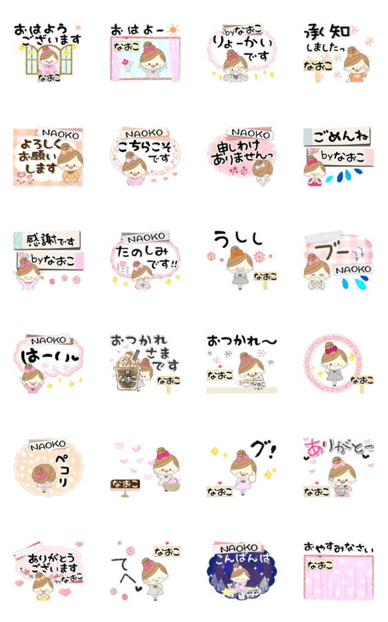 | スタンプ説明 | なおこ(ナオコ、尚子、直子、奈緒子…)さん専用の動くお名前スタンプです。全国のなおこさんへ使っていただけたら嬉しいです!なおこさんへのプレゼントにもどうぞ。 |