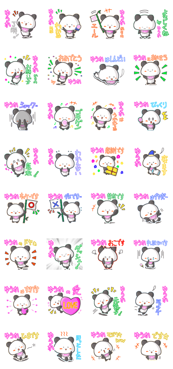 ゆっけ。が贈る[ゆうか]名前スタンプです。優香,夕夏,優佳,優華,佑香,優花,裕香,夕花,憂佳,優夏,夕華,ゆう花さんなどに!ゆっけフレンズ「甘えたな赤ちゃんパンダ」です。