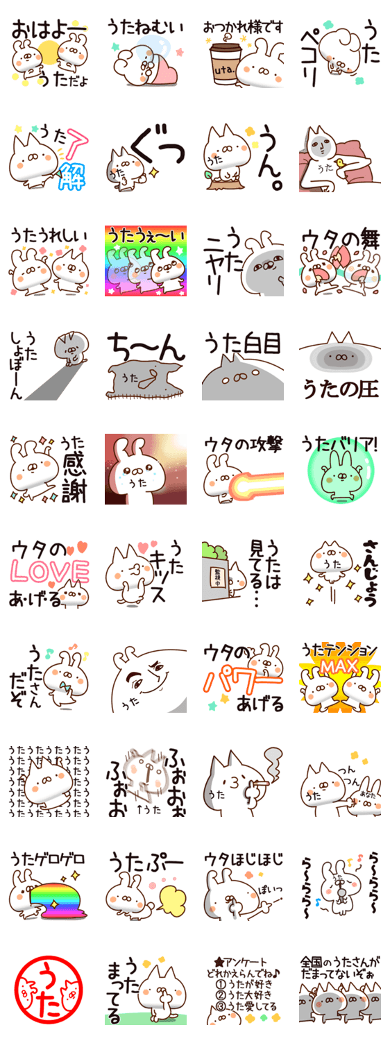 うた/ちゃん/さん/君/使う/名前/あだ名/名字/スタンプ/ウタ/歌/うたちゃん/うたこ/うたみ/うたか/うたの/うたね/うたは/うたまる/こうた/ゆうた/宇多/詩/唄/専用/面白い