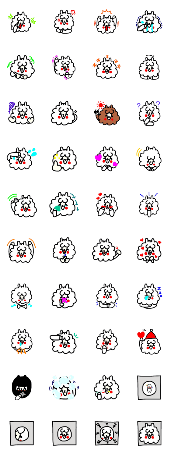 | スタンプ説明 | たれ目がチャームポイントのアルパカのスタンプです。顔をアップにしたアルパカがメインのスタンプです。 |