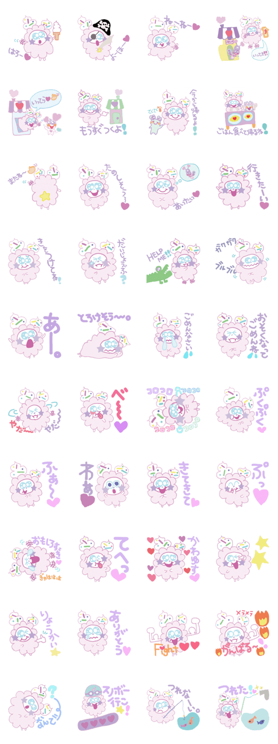 キューティーフェアリーズの新しい仲間が登場。ひつじみたいなモコモコのからだに、アイスクリームみたいのがついてるよ。しっぽは星型。海賊、スノボー、釣りしてる。