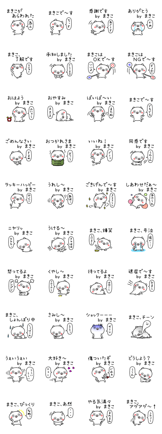 真紀子、牧子、麻紀子、眞紀子…、全国の「マキコ」さん専用の猫キャラ名前スタンプ、日常会話の基本セットです。友だちとお揃いで使える「ちゃんねこシリーズ」です。