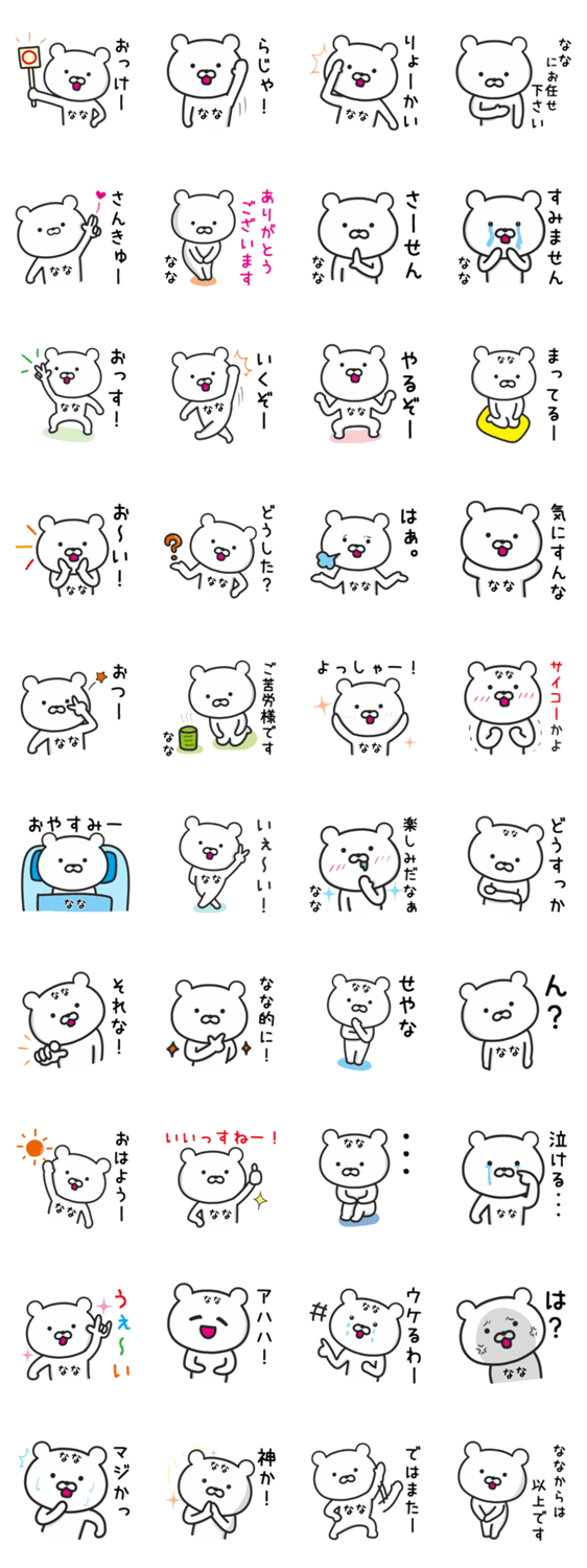 「なな」さんが使える、くまの名前・あだ名スタンプです。ナナ,ななみ,ななえ,ななこ,ななか,奈々,那奈,那々,奈菜,菜奈,菜々,七奈,菜那,南那,奈々子,菜々子,七恵,七海など