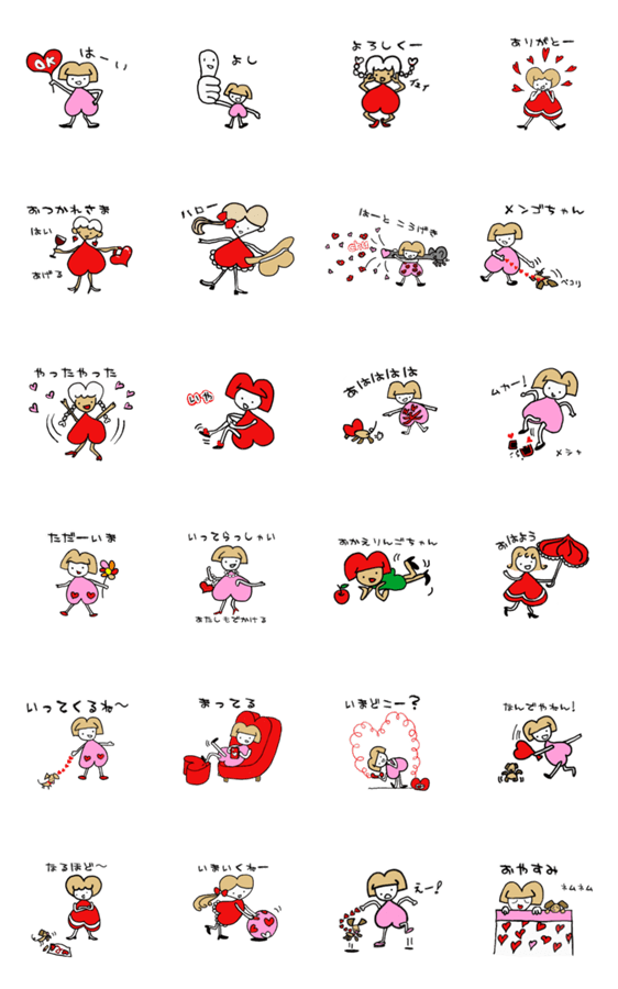 ハート大好き女の子、はーとちゃんのスタンプです。日常でつい使ってしまう言葉は、たまにちょっぴり態度デカめ。でもなぜか憎めず。