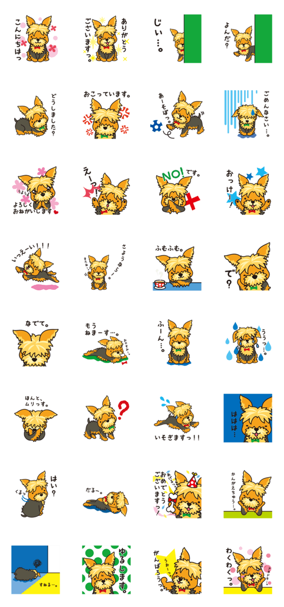 | スタンプ説明 | 日常で使用できるヨークシャテリアの「うにおさん」スタンプ(イラストバージョン)です。 |