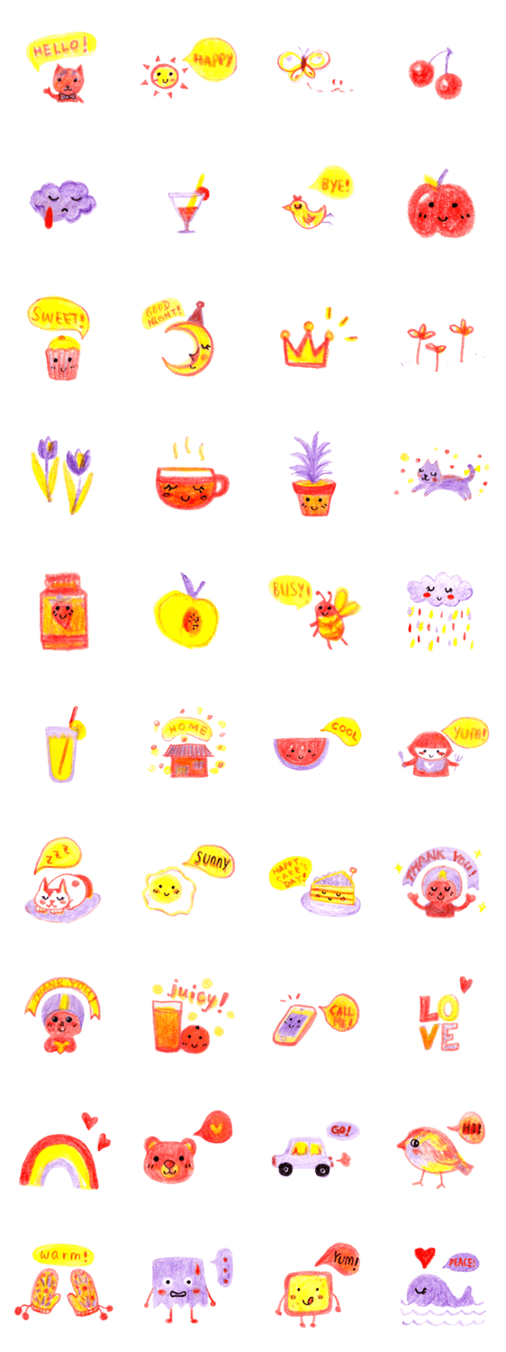 | スタンプ説明 | Little things that brighten up the day. Original emoticons hand drawn with orange, yellow and purple colored pencil. |