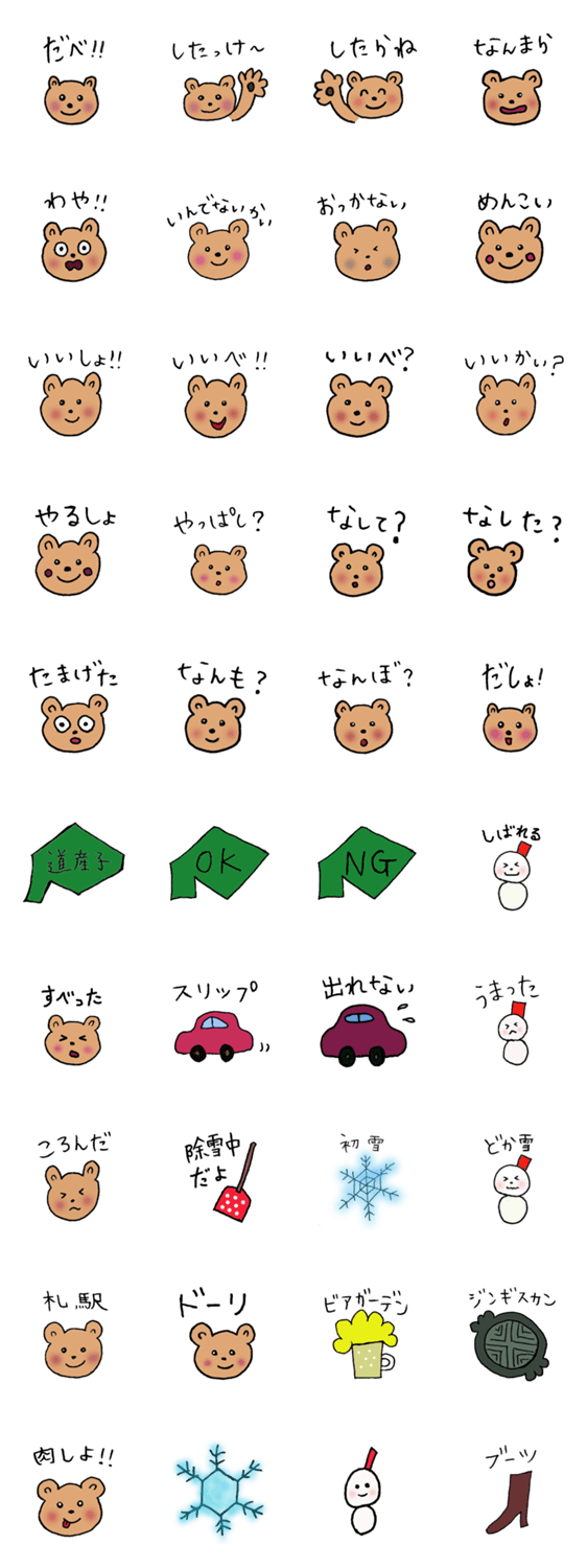 道産子が良く使う方言を可愛いくまさん、雪だるまさんで表現しました!あったらいいなと思ったスタンプです!