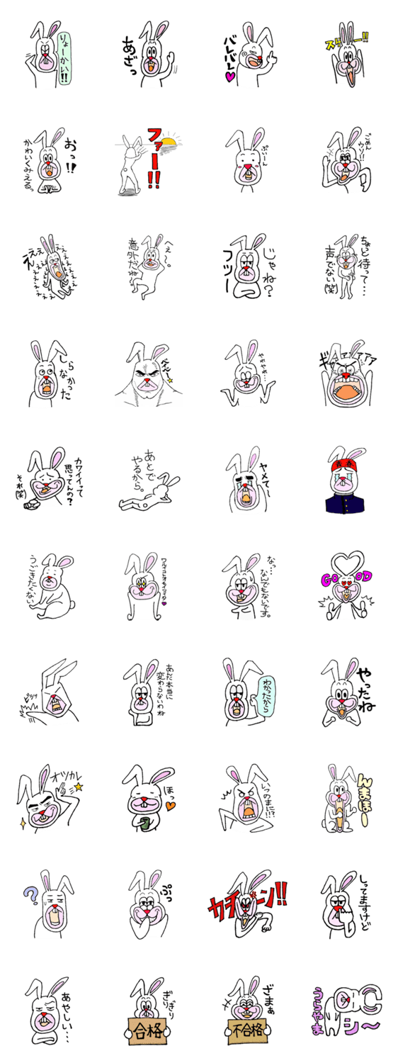 彼の名前は白ウサギのウサヒロ君。彼は思ったことをなんでも口に出しちゃう性格です。喜怒哀楽だけでなく、いろいろな表情をします。文章を打つ時間がないときに便利です。