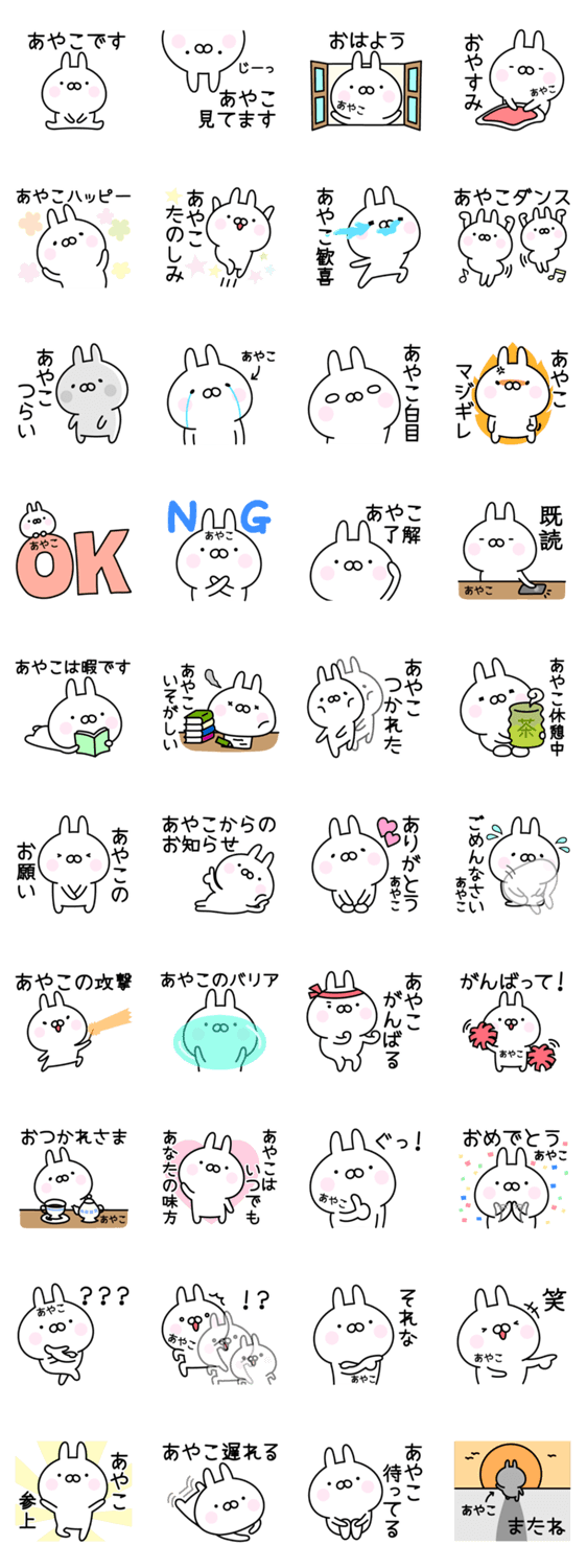 あやこさん、あやこちゃんが使いやすいお名前スタンプです。かわいいうさぎが、あやこさんの気持ちを表してくれています。あやこさんへのプレゼントにも最適です。