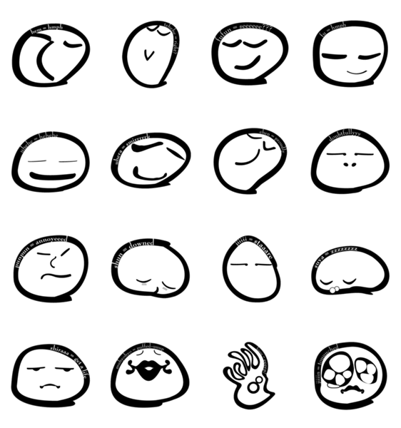 フッ、テヘヘ、ホゲー、シュン、シラー、ジーン etc… アニメに出てくるような擬態語や擬情語をシンプルなあわぶくの顔で表現しました。