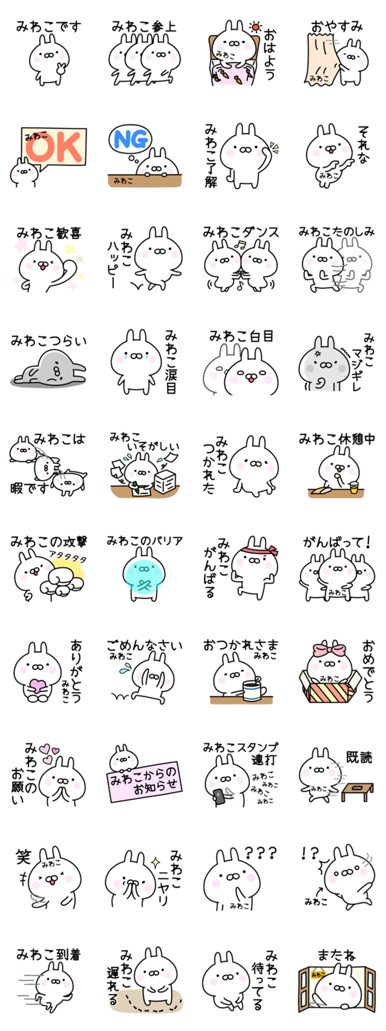 みわこさん、みわこちゃんが使いやすいお名前スタンプです。かわいいうさぎが、みわこさんの気持ちを表してくれています。みわこさんへのプレゼントにも最適です。