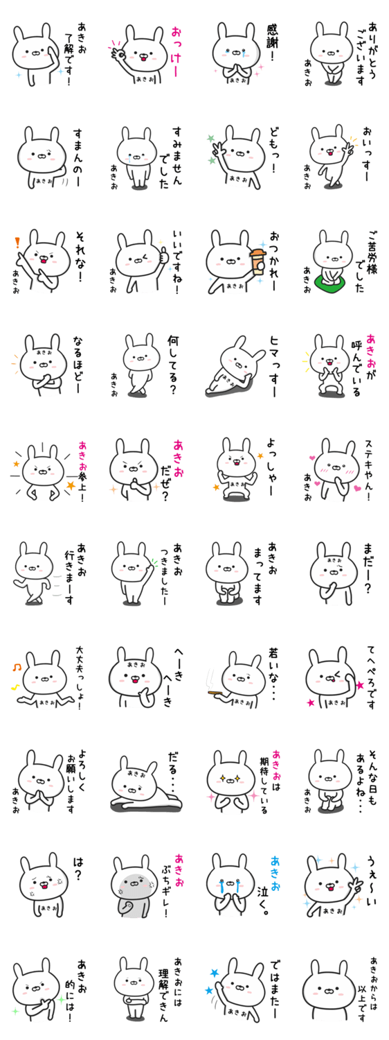「あきお」さんが使える、うさぎの名前スタンプです。昭夫,章夫,明夫,昭雄,昭生,章男,彰男,暁夫,暁,昭男,アキオ,明男,明雄,明生,光生,章生,晃生,章雄,昭郎,晶雄,彰朗。