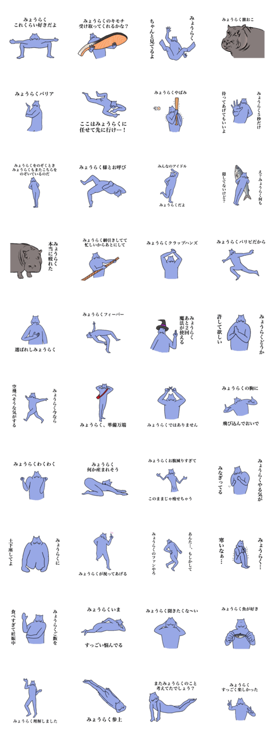 全世界のみょうらくのためのスタンプ。みょうらくはカバ。魚が好き。時々リアルな表情をする。