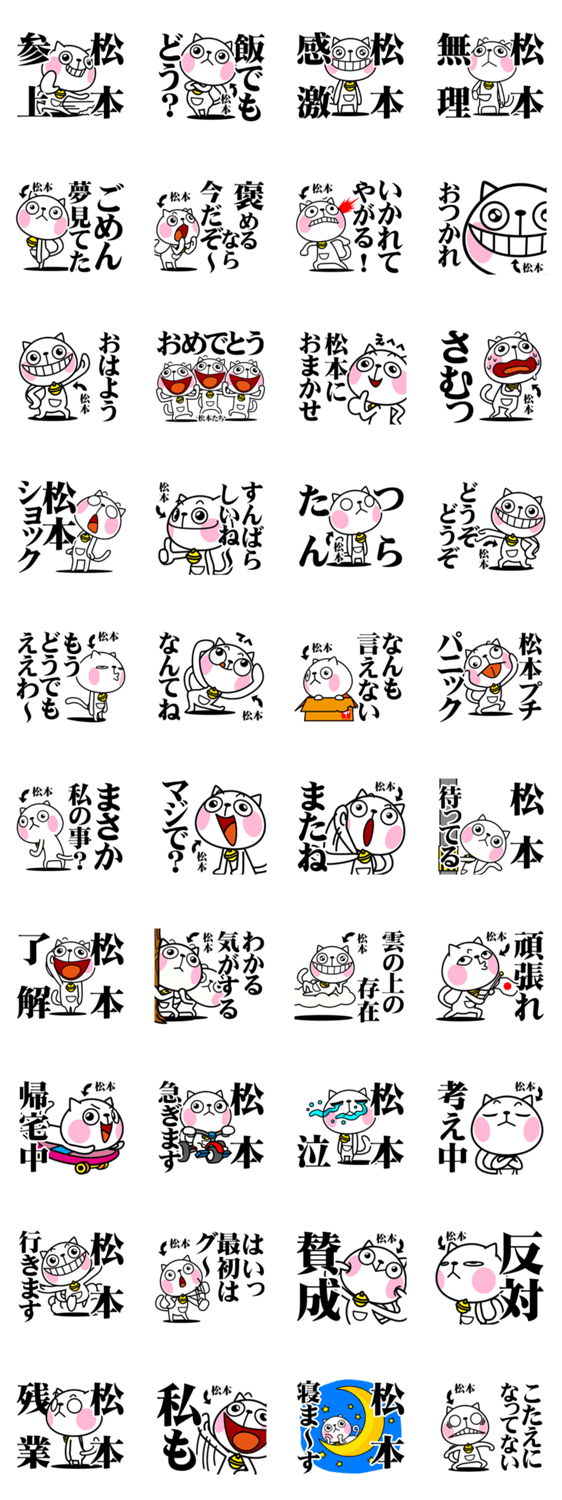 | スタンプ説明 | 大人気ウサギ魂の友達、ネコ魂が【まつもと】さんの魂を受け継ぎスタンプになって登場です。全国の松本さん!楽しく使ってね。松本さんが大好きな方もプレゼントにどうぞ! |