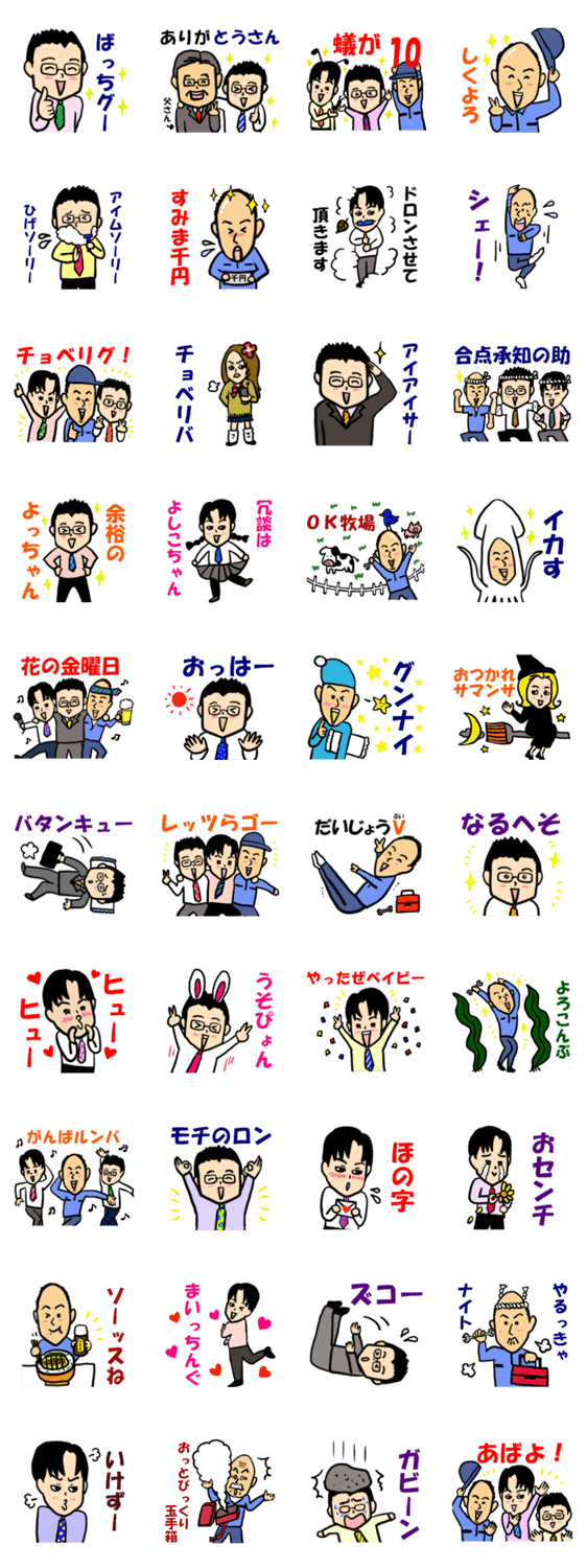 | スタンプ説明 | タイプの違う三人のサラリーマンが懐かしい死語で笑わせます。昭和、平成の死語を楽しんで下さい。会社員、社会人、メガネ、スーツ、作業着、営業マン、技術屋、エンジニア |