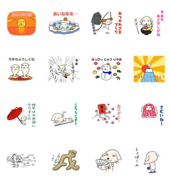 2018年は戌年。新年の挨拶、年賀状の代わりに楽しい犬の動くスタンプです。かわいい犬と凧揚げ、雪、お餅とお年玉も登場。 年末年始、お正月、冬の行事はこれでばっちり!