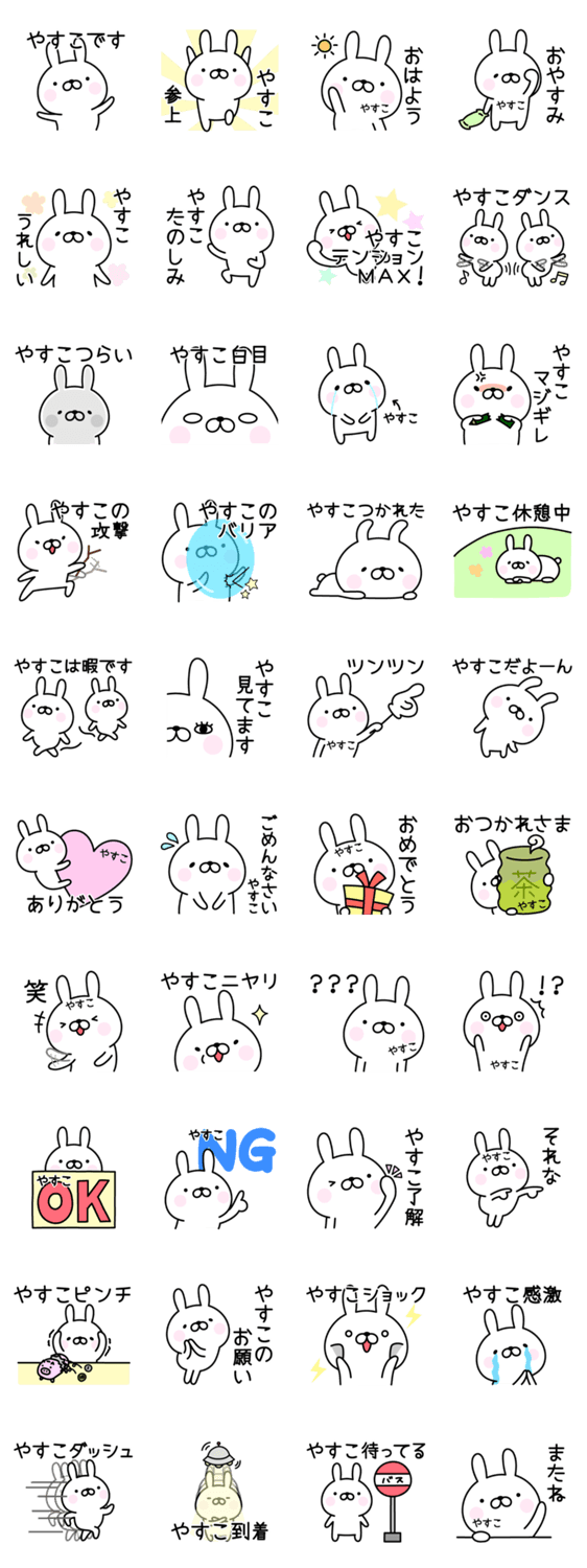 やすこさん、やすこちゃんが使いやすいお名前スタンプです。かわいいうさぎが、やすこさんの気持ちを表してくれています。やすこさんへのプレゼントにも最適です。